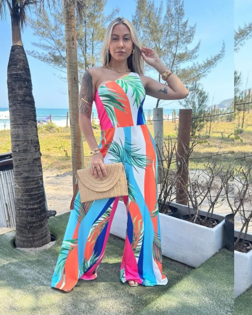 Macacão de um ombro só em malha fluity . Se destaca por ser leve, macio, ter um toque gelado e ser resistente, não desbotando nem criando bolinhas A malha fluity é ideal para a nova estação